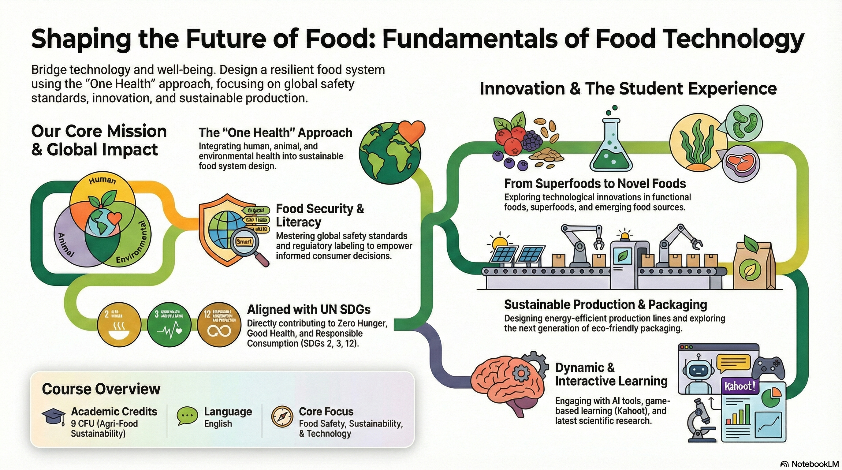 Why this course matters. In contemporary society, the way we produce, transform, distribute, and consume food is inseparable from both human health and the future of our planet. For this reason, the course is built around a set of core pillars.